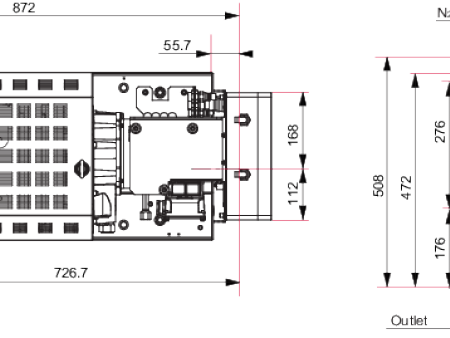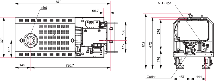 图纸标注了 “Inlet(进气口)”“Outlet(出气口)”“N₂ Purge(氮气吹扫)” 等关键部件,还详细标注了各部分的尺寸参数,属于该品牌真空设备的技术图纸类资料,用于指导设备的安装、集成以及空间规划,为用户提供精确的尺寸参考。