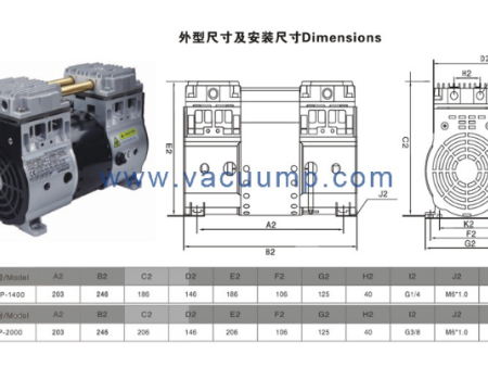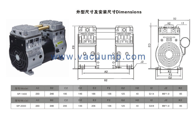 无油活塞真空泵的外型与安装尺寸图,对应型号包含 SP-1400/2000 系列。该图纸标注了整机总长、接口高度、安装孔距等关键尺寸,清晰对照两种型号的差异,为真空系统机柜开孔、设备装配及管路连接提供依据。适配实验室、制药、自动化吸附等场景,尺寸标准、安装便捷,保障真空设备的稳定运行与空间利用率。