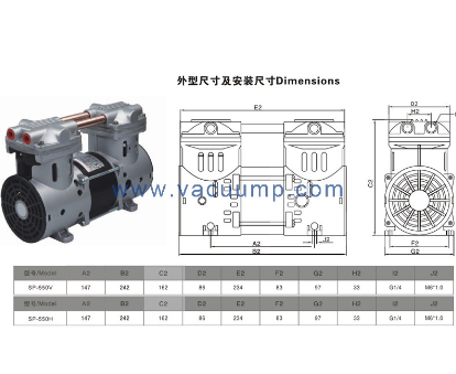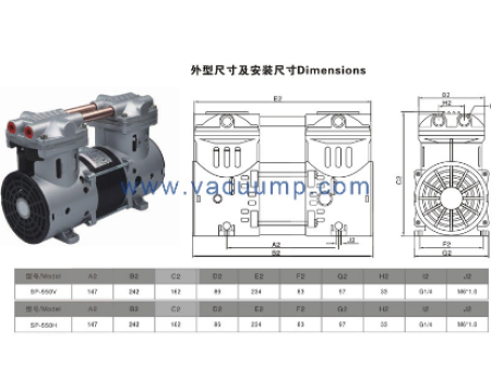 无油活塞式真空泵(SP-550V/SP-550H 系列)的外型与安装尺寸图。图纸标注了整机总长、安装孔距、接口规格等关键参数,清晰对应两款型号的尺寸差异,为真空系统机柜开孔、设备装配、管路连接提供依据。适配实验室、自动化、真空吸附等场景,尺寸标准、安装便捷,保障设备稳定运行与空间利用率。