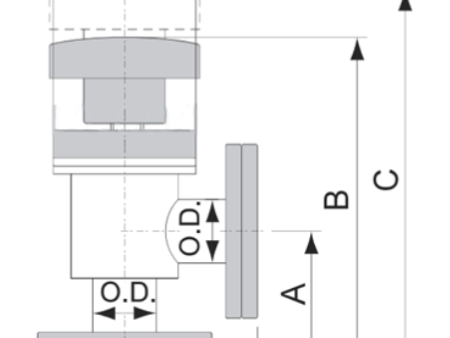 高真空手动挡板阀(GD 型手动真空角阀)的结构尺寸示意图,标注了 A(法兰外径 / 安装尺寸)、B(阀腔高度)、C(总高度)、D(手轮直径)及 O.D.(通径)等关键参数。用于明确产品外形、安装空间与接口规格,为真空系统管路设计、选型安装提供尺寸依据,适配各类高真空 / 超高真空工况。