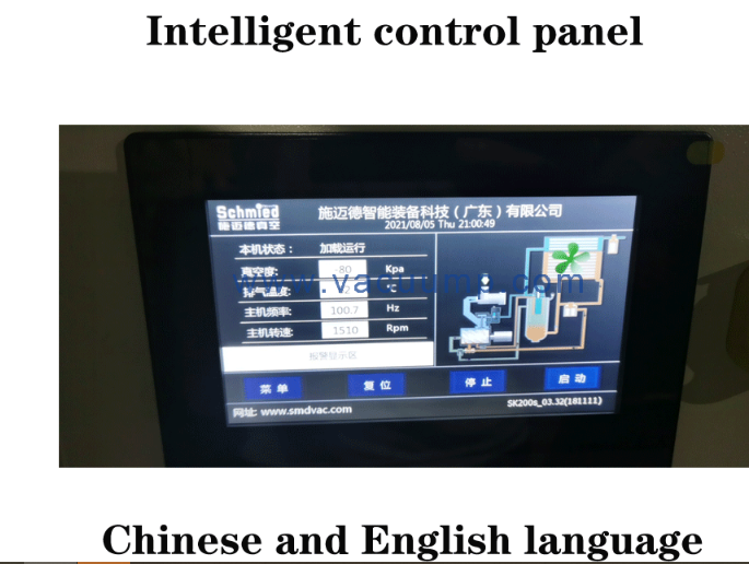 施迈德(Schmied)真空机组智能控制触控面板,是设备的核心人机交互单元。搭载中英文双语言界面,可实时显示真空度、转速、频率、温度等运行数据,直观展示系统流程图。支持一键启停、参数设置与故障复位,操作便捷直观,为真空设备提供智能管控与状态监控,保障系统稳定运行。