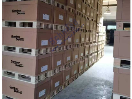 Gardner Denver(加德纳丹佛)品牌真空泵的成品仓储备货区,所有设备均以原厂标准木箱封装,整齐堆放在托盘上。品牌源自德国,旗下涵盖里其乐等知名真空泵系列,是工业真空领域的标杆品牌,为客户提供稳定可靠的设备供应与快速交付保障。