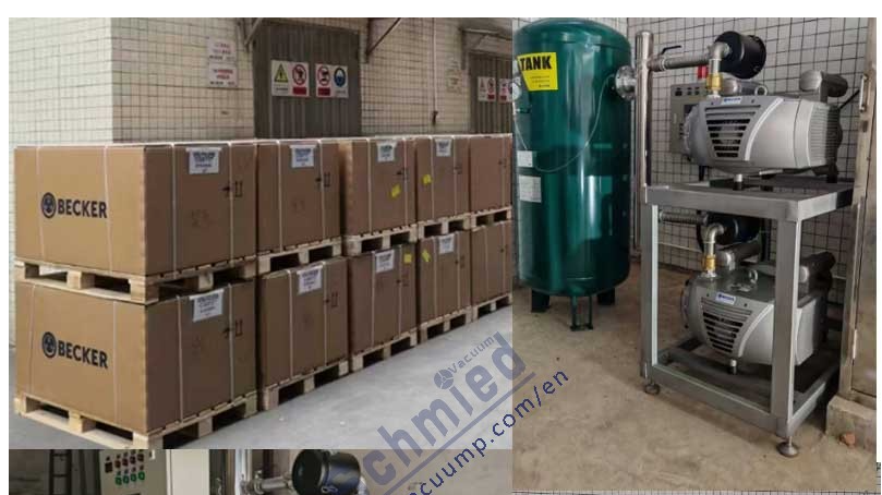 BECKER(贝克)真空泵配套真空系统整备现场。贝克为德国真空品牌,图中为其真空泵搭配储气罐、支架等设备组成的完整真空系统,用于稳定供气、保压或抽真空作业,适配工业生产、实验室等需持续稳定真空的场景,运行可靠、维护便捷。