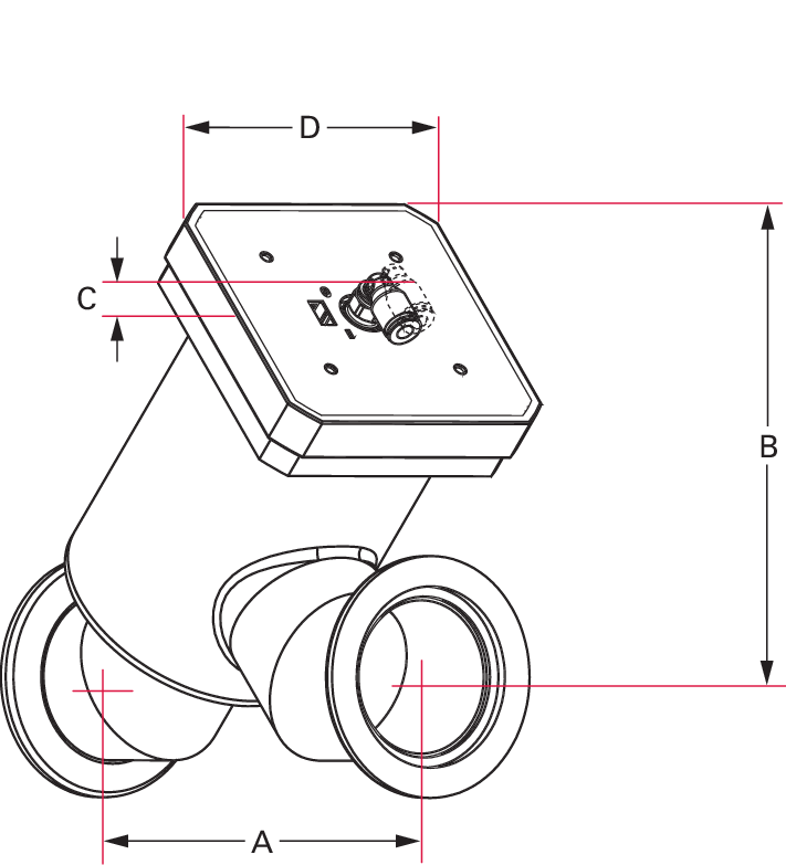 电动真空角阀的安装尺寸图,是该阀门的配套技术图纸,对应电动真空角阀产品。图中标注了 A、B、C、D 等关键安装尺寸参数,用于指导该阀门在真空系统中的安装适配,帮助确认其安装空间与管路连接的匹配情况,是该阀门安装过程的重要参考图纸,可保障安装契合系统布局。