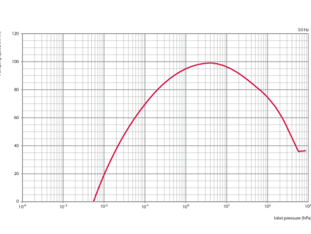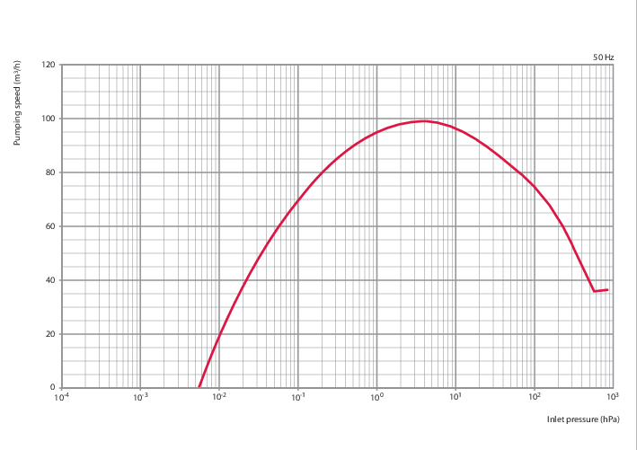 普发真空(Pfeiffer Vacuum)某型号干式真空泵的抽速曲线,用于呈现该泵在 50Hz 工作频率下,抽气速率(纵轴,单位 m³/h)随入口压力(横轴,单位 hPa)的变化规律,是评估其真空性能的关键图表之一。