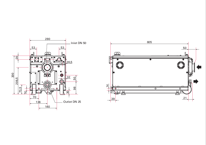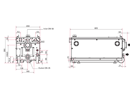 普发真空(Pfeiffer Vacuum)某型号干式真空泵的尺寸图纸,标注了该泵的进气口(Inlet DN 50)、出气口(Outlet DN 25)等关键部件的位置及整体的长、宽、高尺寸参数,用于指导设备的安装、适配等工程应用场景。