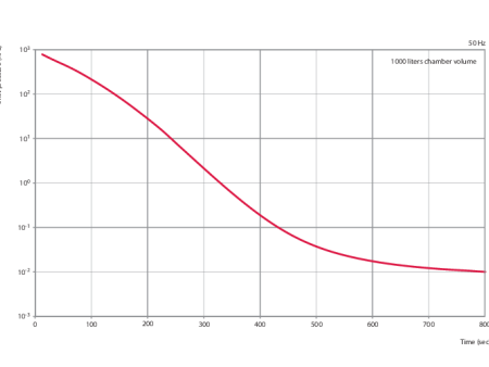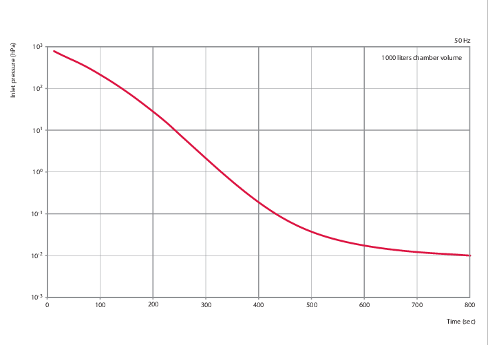 普发真空(Pfeiffer Vacuum)某型号干式真空泵的抽气时间 - 入口压力曲线,展示了在 50Hz 工况下,对 1000 升容积的腔室抽气时,入口压力(纵轴,单位 hPa)随时间(横轴,单位 sec)的变化关系,用于体现该泵的抽气效率和真空建立过程。