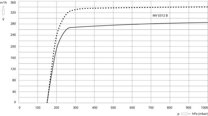 BUSCH(普旭)MINK MV 0312 B 爪式真空泵的抽速 - 压力性能曲线,展示了该型号在不同压力(单位:hPa/mbar)下的抽速变化(单位:m³/h),可辅助工业场景评估其在不同真空工况下的性能表现。